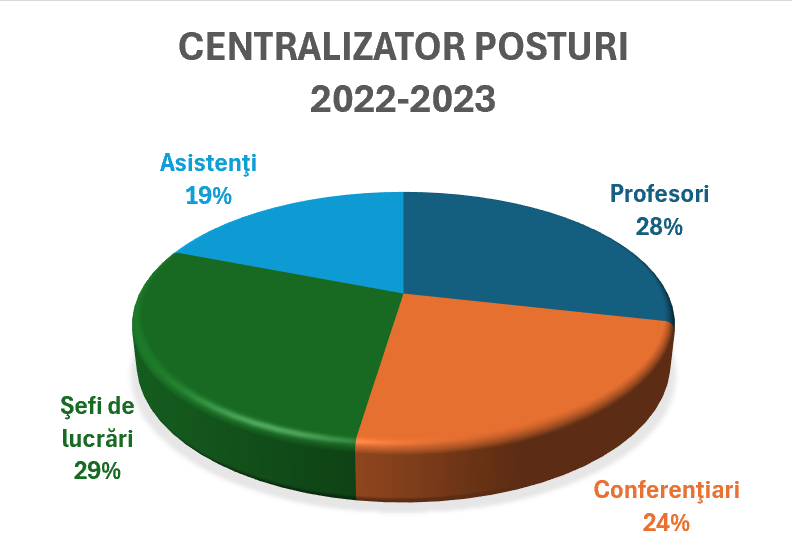 În anul universitar 2022-2023, statul de funcții al departamentului a cuprins un număr total de 43 de posturi, 22 dintre acestea fiind vacante.